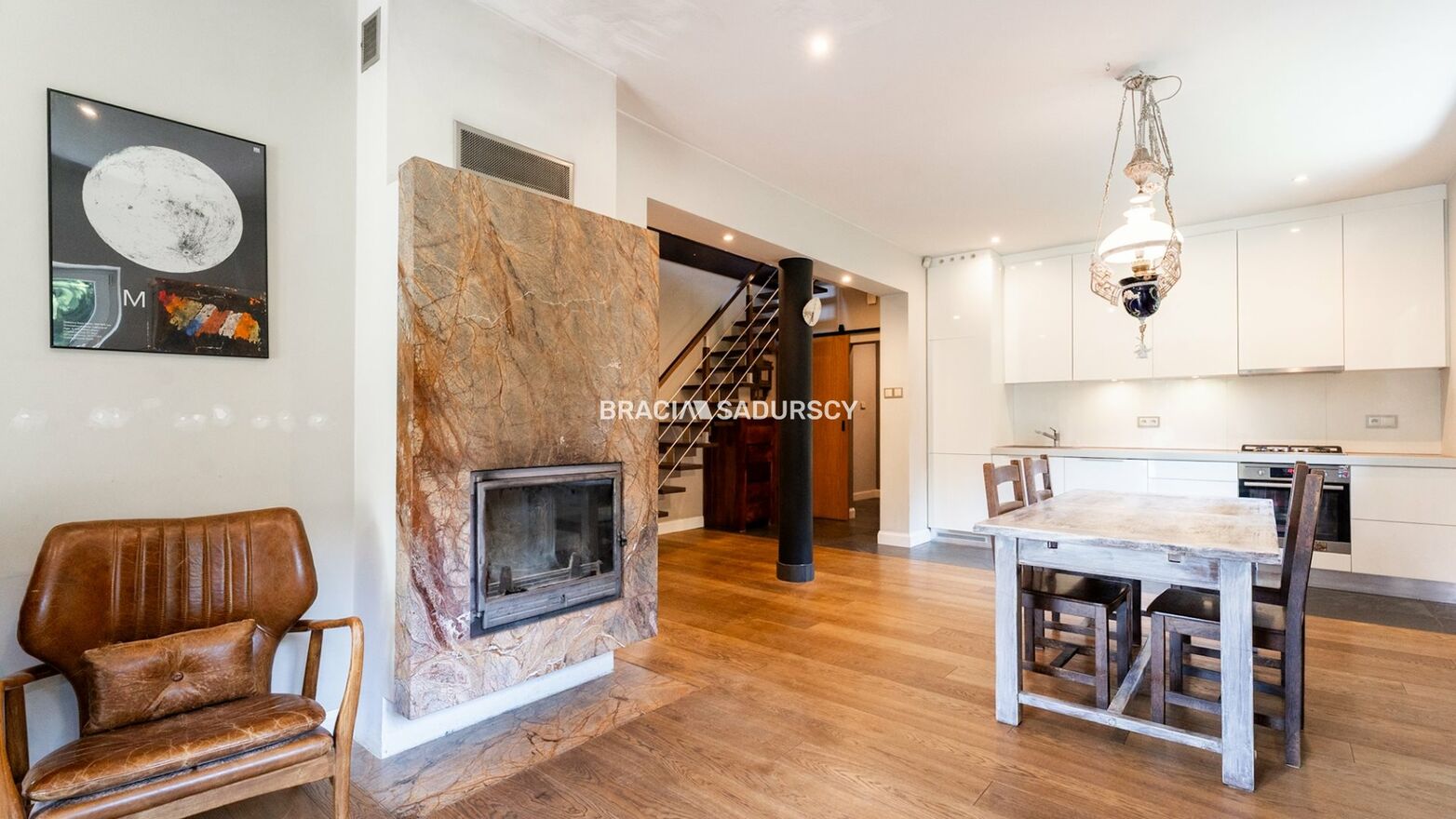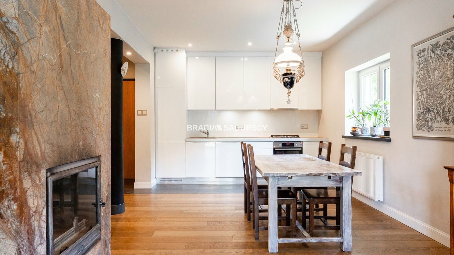 - obszerna przestrzeń kuchenna z zabudową po sufit i wyjściem na duży, drewniany, naturalny taras (bankier, 25 mkw) oraz kominek (z rozprowadzeniem ciepła do pomieszczeń na piętrze). W kuchni do dyspozycji użytkowników zmywarka, lodówko-zamrażarka, piekarnik, płyta gazowa (sprzęt marek Miele, AEG), na podłodze śliczny łupek.