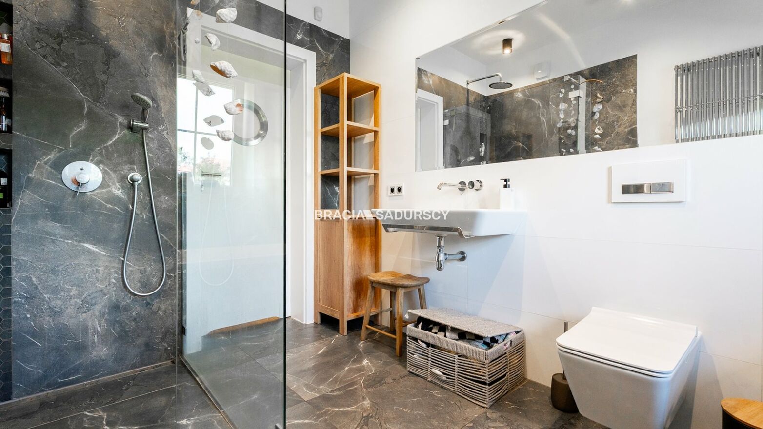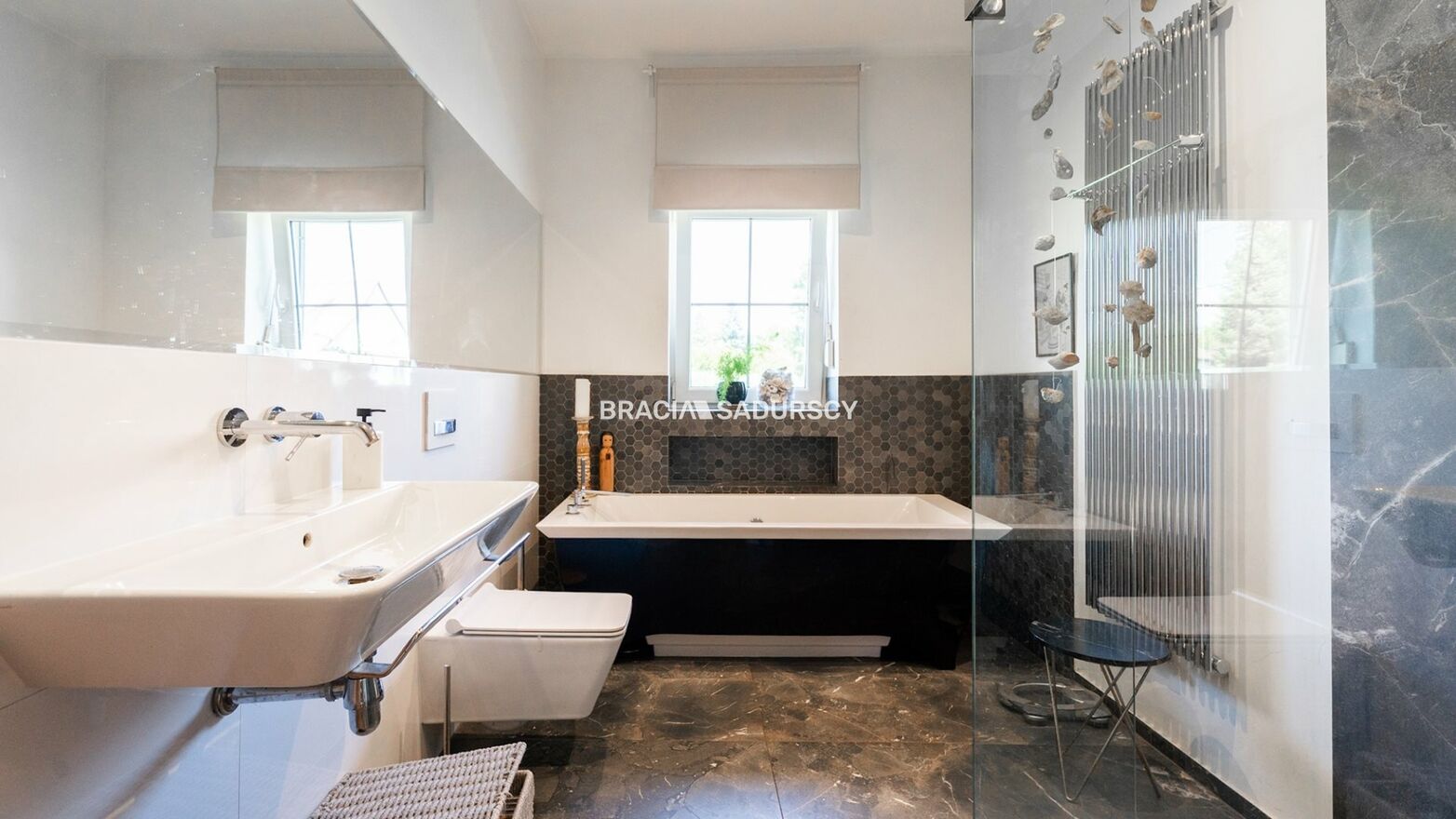 - duża, wygodna łazienka z wanną, prysznicem, umywalką, toaletą i ogrzewaniem podłogowym